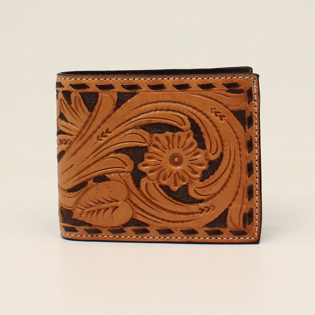Decorative and stylish men’s 3D bifold wallet. It is made of genuine leather and a hand tooled floral pattern and brown buck stitching along the edges.