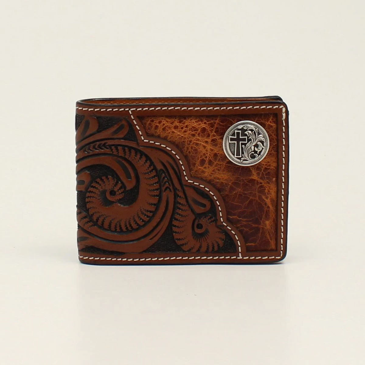 You will love showing off this men’s 3D bifold wallet that is made of genuine leather and has a tooled floral design that wraps around the back of the wallet. There is a round concho on the top right corner with a matte black cross.
