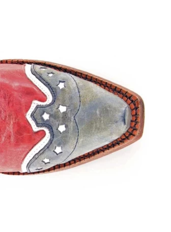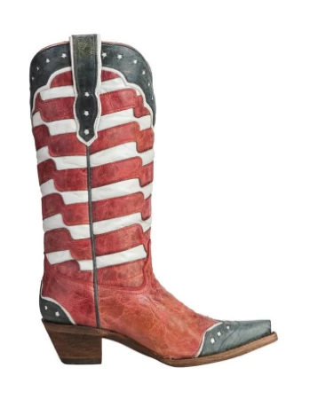 Corral American Flag Western Boots feature a distressed red leather with white striped and stars inlay. Lightly cushioned insole. Distressed leather sole with rubber grip insole.