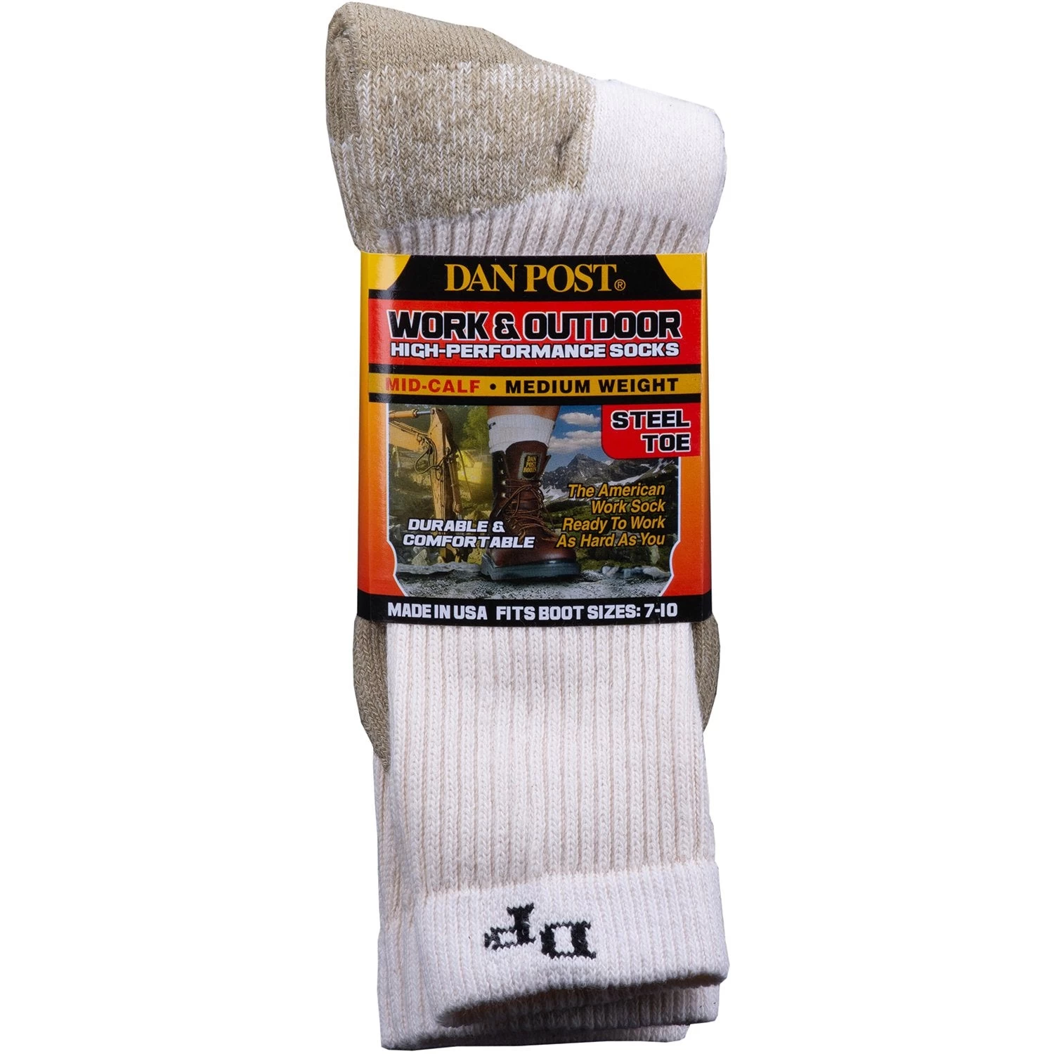 Work and Outdoor Steel Toe socks are great for everyday wear. The wide top band with the ribbed design provides comfort against the leg. The anti-microbial yarn inhibits the growth of odor causing bacteria. The ribbed comfort fit arch supports your arch area. We added extra to the toe area for more comfort. Made in the USA. Two pair natural socks per pack.