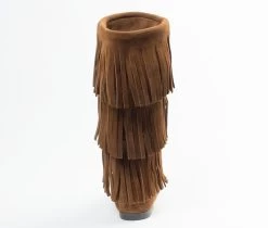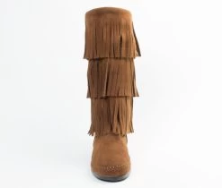 Wear these famous and versatile boots with your favorite mini skirt, leggings or skinny jeans-just like trendsetters and fashionistas everywhere. The three layers of suede fringe wrap all the way around, swaying with your every step for a little flirty fun. These suede leather boots meet you mid-calf. Slip them on for dancing, concerts or a quick and easy fashion statement.
