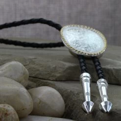 A simple design with intricately beautiful details make this silver bolo tie transition perfectly between casual and formal wear. The tall oval slide is trimmed with a fine gold twisted rope around silver filigree engraving from edge to edge with two floral flourishes placed opposite at the top and bottom. The black braided leather cord is nicely weighted with two silver arrow pointed tips.