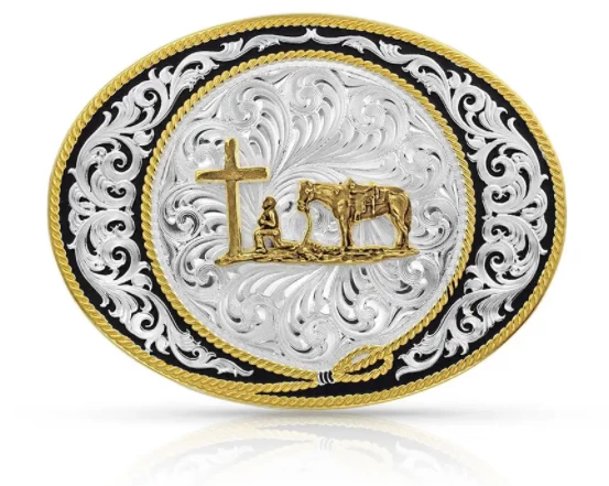 At the center of our “Ranch Rope Christian Cowboy Buckle” kneeling before an antiqued gold finished cross is a man holding the reins to his reverent horse. A gold finished rope lassos from the outside of the buckle inwards to frame the scene and contains a silver and black finish in classic old West billfold patterns. Perfect for church on Sundays or rodeos, this Montana Silversmiths’ buckle is one of a kind. Standard 1.5 inch belt swivel.