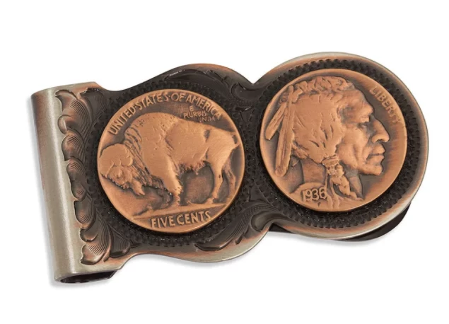 Scalloped silver money clip is fully engraved with western style silver filigree across the top perfectly surrounding two replicated US Buffalo and Indian Head nickels, arranged to show each side of the coin.