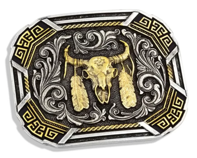 Add a little flavor of the Southwest to your outfit with this two toned Attitude buckle with a large center gold toned ceremonial buffalo skull figure surrounded by thicker antiqued silver toned filigree with an outer thick edging with stylized renderings of Southwestern designs in gold toned lines highlighted by a black background with accented lines of smooth silver running parallel and perpendicular to the gold toned lines. Standard 1.5 inch belt swivel.