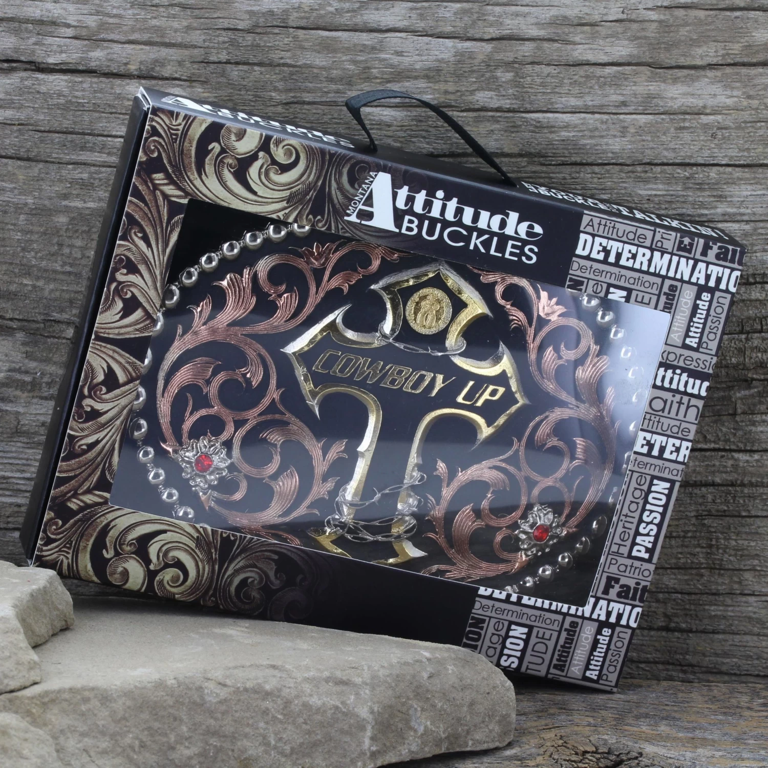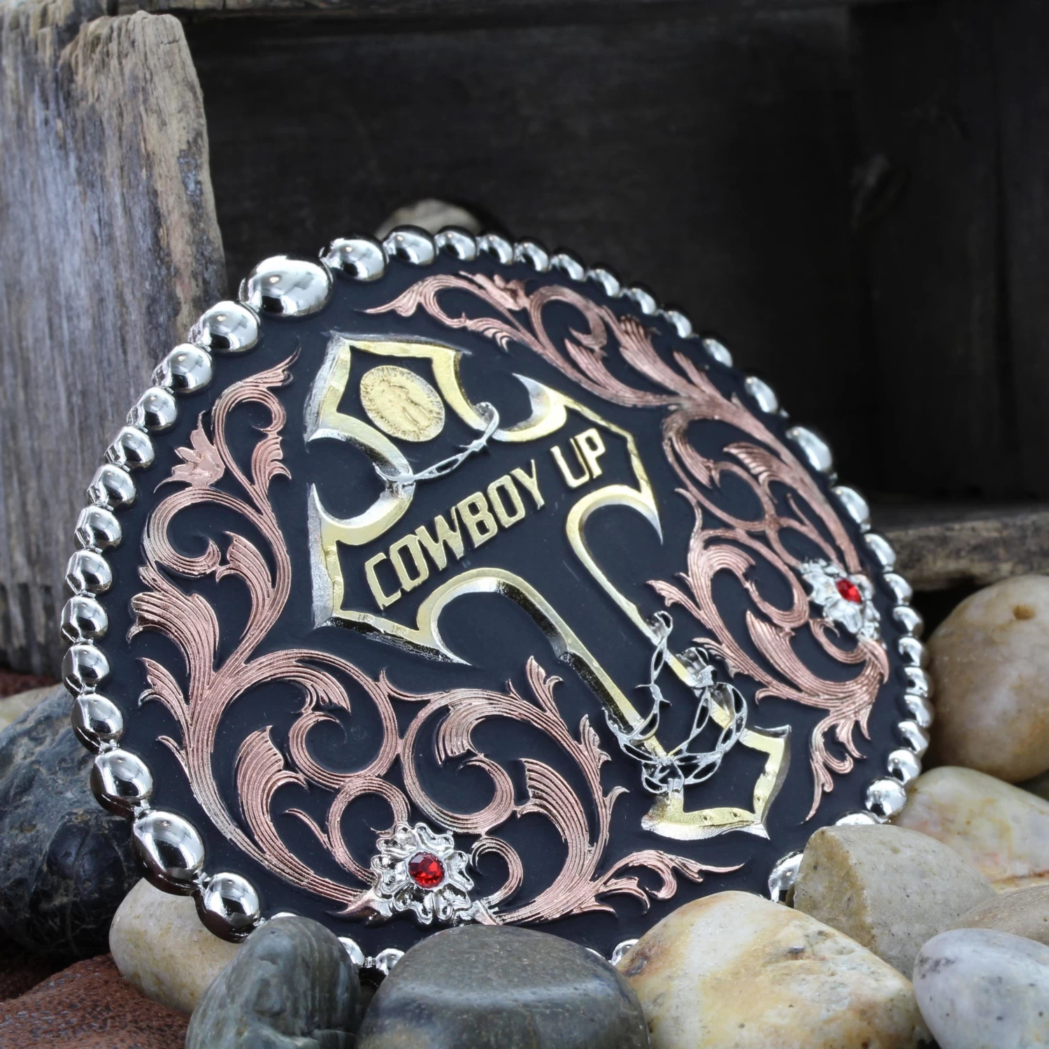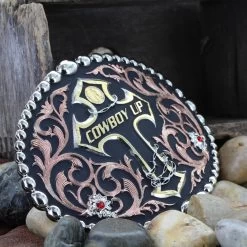 What does a cowboy do when he gets knocked down? This tri color Cowboy Up Attitude buckle gives us words to live by – “Cowboy Up” – emblazoned in gold across a silver and gold cross wrapped. Silver barbed wire coiled around the cross express that extra tough attitude. Surrounded with bright copper filigree with two silver flower accents set with ruby colored stones all framed with high dome polished silver beads around the edge. Hand painted black. Standard 1.5″ belt swivel.