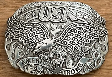 This silver Nocona buckle features a soaring eagle with “USA” above the eagle. The eagles feet are perched on a ribbon that says “American Strong” and has flames in the background. Measures 4-1/2″ x 3″