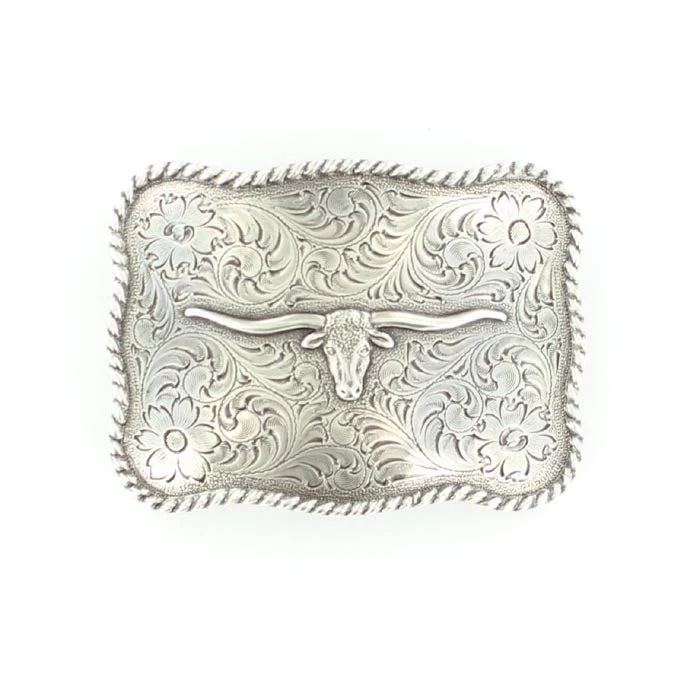 Scalloped rectangular Nocona buckle by M&F Western Products trimmed with rope edging. Floral background etched into the silver with longhorn head in center. Boxed for easy gift giving for that special cowboy. Rectangle buckle measures approx 2-3/4 x 3-3/4