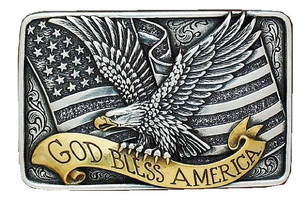 Show your American pride with the Nocona God Bless America Eagle Belt Buckle 37015, this is a two-toned square buckle by M&F Western Products®. It has an American Flag with a raised Bald Eagle and God Bless America in a scroll ribbon.