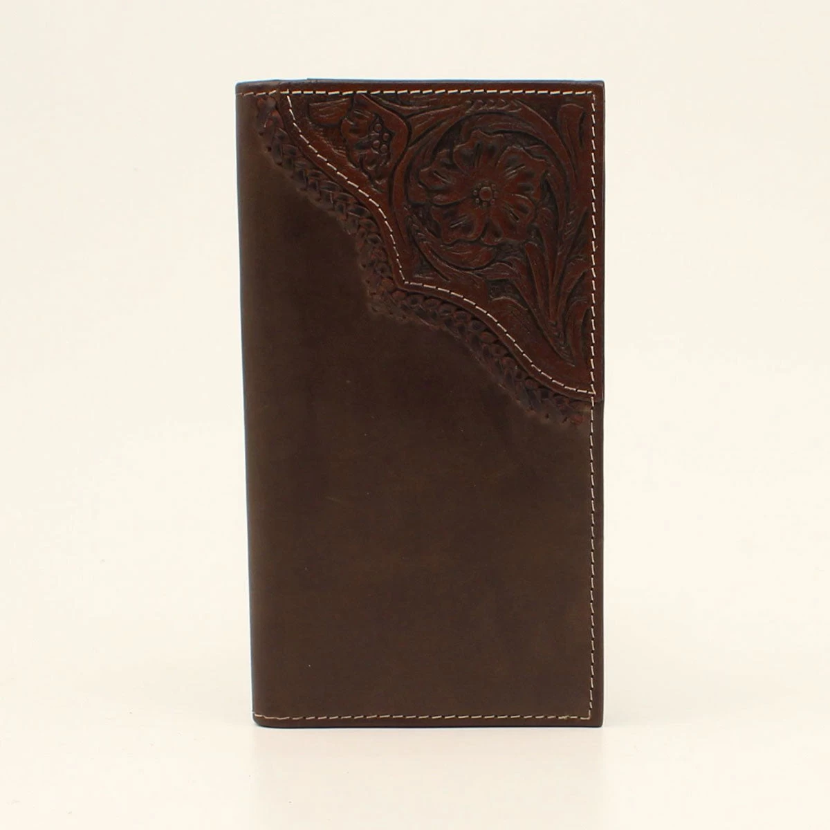This Nocona leather rodeo wallet by M&F Western Products has a floral tooled upper right corner. Beautifully accented with a braided leather edge.