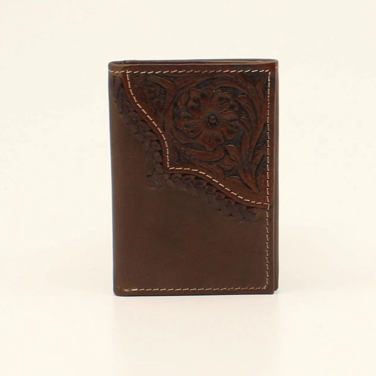 This Nocona leather trifold wallet by M&F Western Products has a floral tooled upper right corner. Beautifully accented with a braided leather edge.