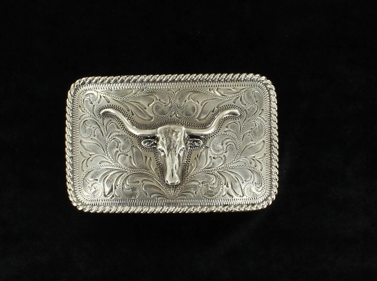 This rectangle shaped buckle designed by M&F Western Products has a longhorn with a beautiful western design in background. There is a twisted rope edge border.