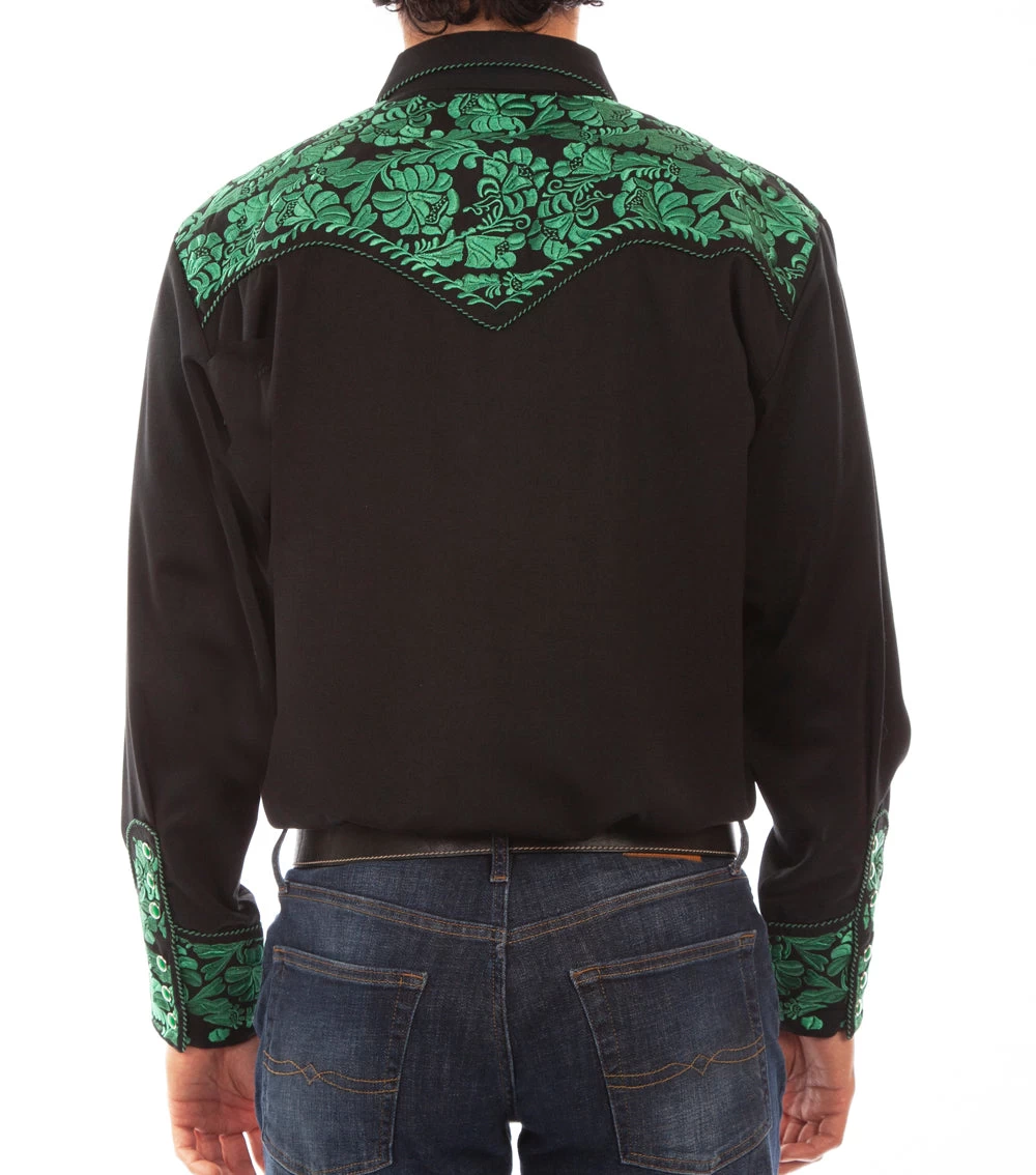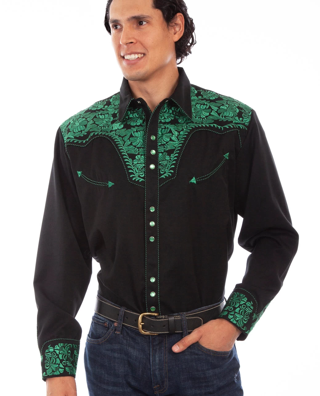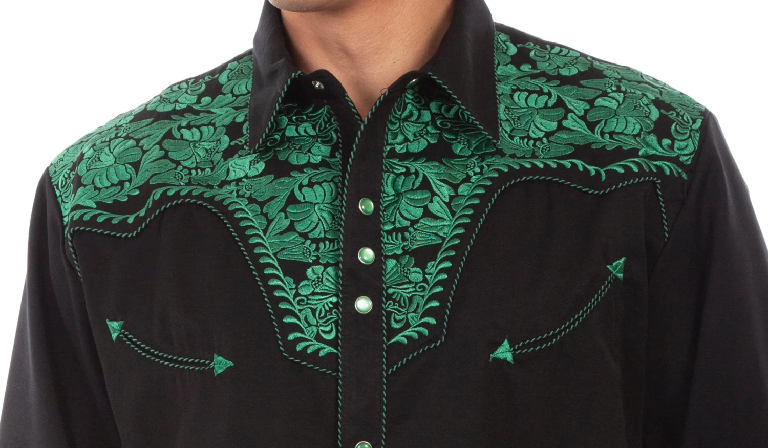 If you are looking for that authentic Western style, Scully has created it in this Retro Gunfighter western shirt.  Scully is known for their intricate detailing, which is seen in the floral design in the yokes and the piping around the yokes, the cuffs, and the pockets.