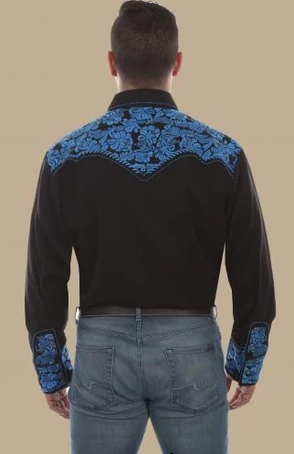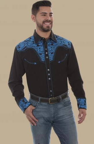 If you are looking for that authentic Western style, Scully has created it in this Retro Gunfighter western shirt.  Scully is known for their intricate detailing, which is seen in the floral design in the yokes and the piping around the yokes, the cuffs, and the pockets.