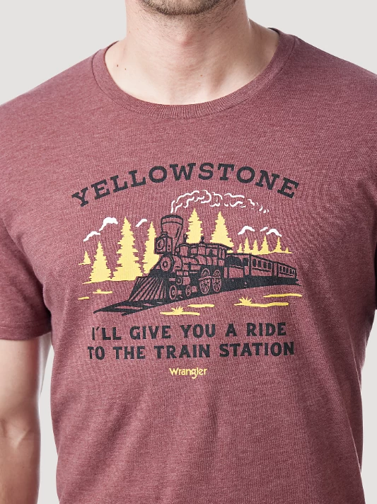 When Rip Wheeler offers you a ride to the train station, you run in the other direction. Luckily, Rip won’t find any fault with you if you’re wearing this short-sleeve t-shirt from the Wrangler® x Yellowstone collection. It’s crafted for comfort from a soft cotton blend you can easily wear all year long. It also comes with a bold chest print of a train speeding down the tracks, surrounded by Montana’s wilderness.